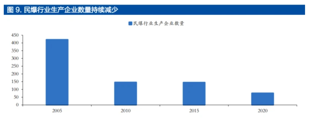 另一個(gè)大背景是,隨著國內(nèi)與民爆關(guān)聯(lián)的基建行業(yè)發(fā)展階段出現(xiàn)變化,以及各行業(yè)對環(huán)境的重視,民爆行業(yè)增速已經(jīng)大幅下滑。據(jù)財(cái)通證券研報(bào),民爆企業(yè)數(shù)量已經(jīng)從2005年的421家降至2020年的76家。