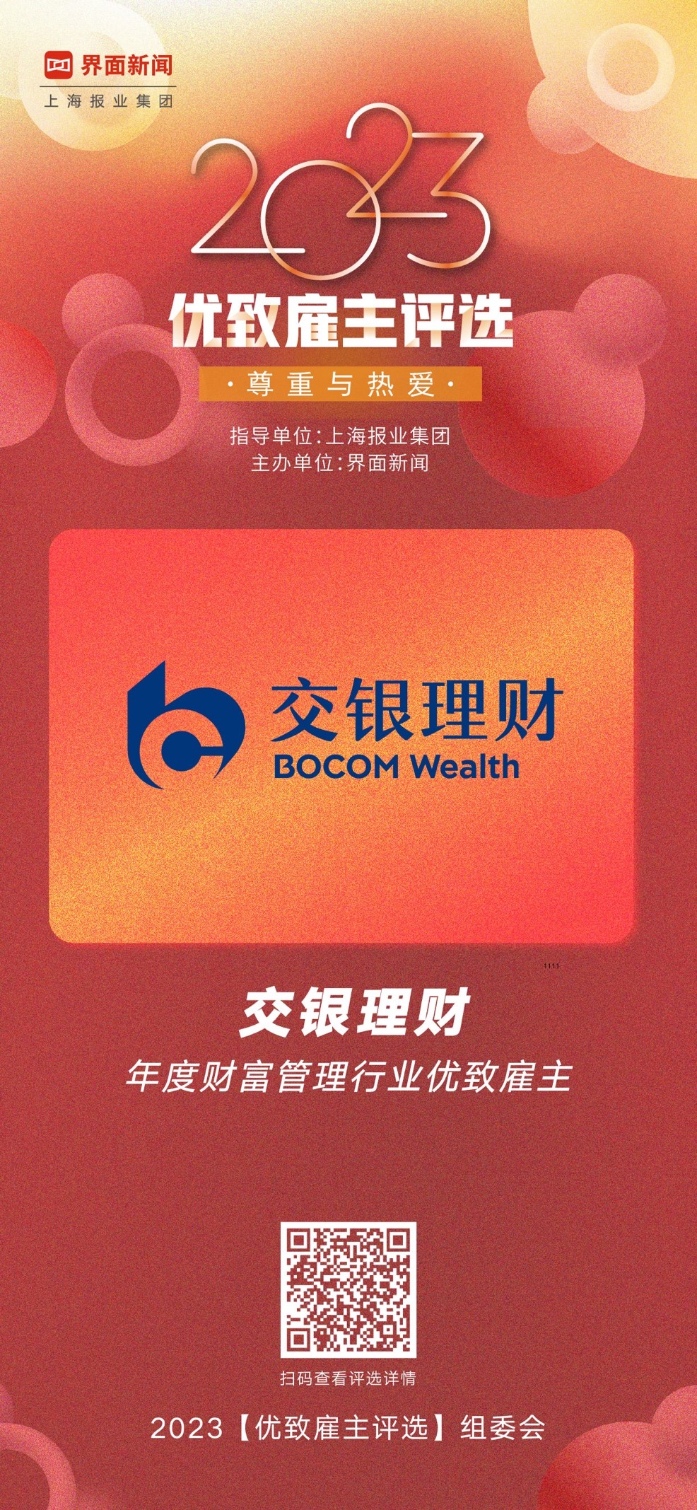 12月13日,上海報業(yè)集團l界面新聞在上海中心舉辦了2023【優(yōu)致雇主評選】頒獎典禮,隆重公布本年度上榜企業(yè)。圍繞尋找和評選最佳雇主這一責(zé)任旨歸,以獨立客觀立場,通過專業(yè)科學(xué)的調(diào)查和評估體系,洞察求職者的需求變化,同時為求職者發(fā)現(xiàn)“好雇主”提供有效參考,實現(xiàn)雇主與雇員的“雙贏”,各行各業(yè)的優(yōu)秀企業(yè)均踴躍參加。交銀理財憑借創(chuàng)新的企業(yè)文化和管理模式以及可持續(xù)發(fā)展理念,榮膺2023【優(yōu)致雇主評選】年度財富管理行業(yè)優(yōu)致雇主。