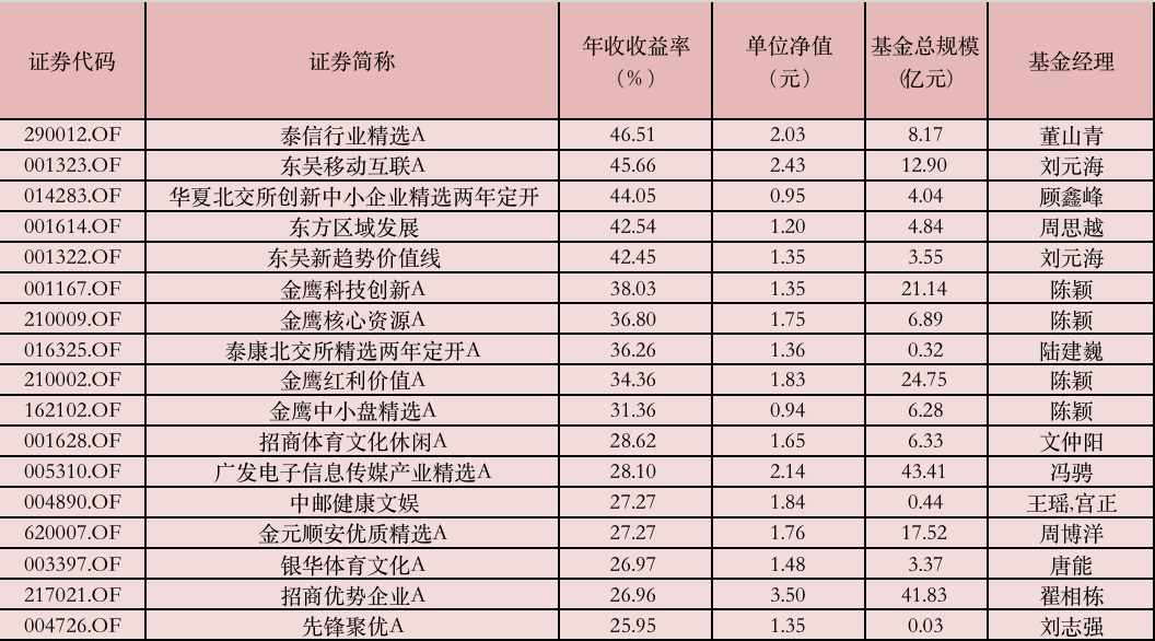 收益居前十的基金均錄得超30%的收益。其中,董山青管理的泰信行業(yè)精選、劉元海管理的東吳移動互聯(lián)和東吳新趨勢價值線、顧鑫峰管理的華夏北交所創(chuàng)新中小企業(yè)精選兩年定開、周思越管理的東方區(qū)域發(fā)展、陳穎管理的金鷹科技創(chuàng)新年內(nèi)收益居前,單只產(chǎn)品之間的業(yè)績差距較小。