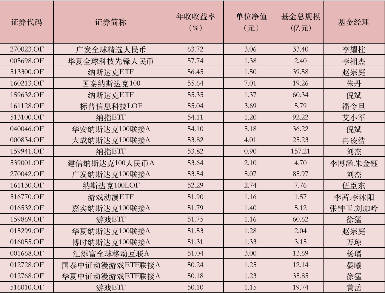 全市場基金中,業(yè)績排名居前的均為QDII基金。過半數(shù)的QDII基金取得正收益,有22只QDII基金收益率超50%,以投向納指科技股的為主,廣發(fā)全球精選人民幣以63.72%的收益率暫居第一。
