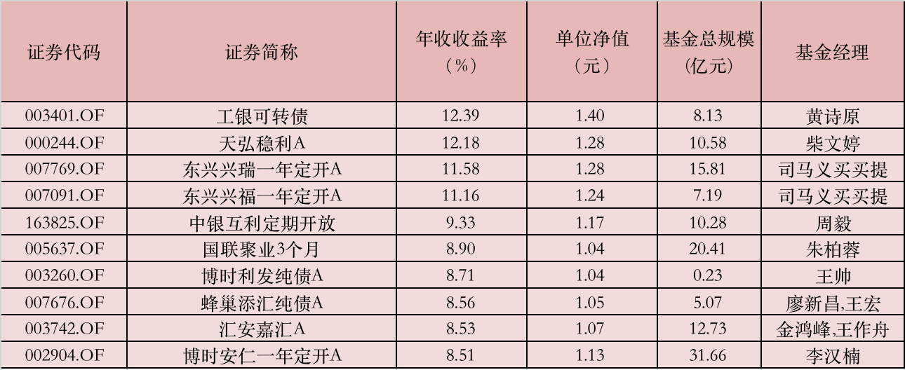 年內(nèi),債市整體偏強。債券型基金表現(xiàn)較好,近九成債基年內(nèi)錄得正收益。工銀可轉(zhuǎn)債、天弘穩(wěn)利、東興興瑞一年定開、東興興福一年定開年收收益超10%,其中工銀可轉(zhuǎn)債以12.39%的年內(nèi)收益率位居榜首。