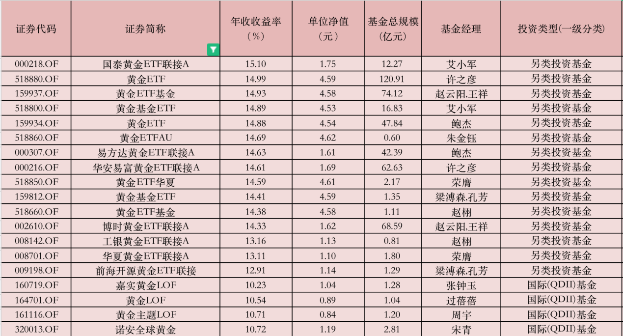 此外,由于金價走強,另類投資基金中,建信上海金ETF、富國上海金ETF、華安黃金ETF、博時黃金ETF、南方上海金ETF、國泰黃金ETF聯(lián)接A等多只黃金主題基金年內(nèi)收益超10%。