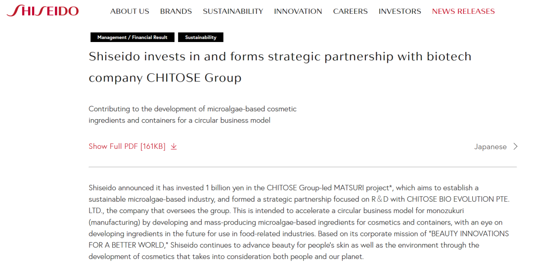 7月11日,資生堂集團(tuán)宣布,已向由生物科技公司千歲(CHITOSE)集團(tuán)主導(dǎo)的MATSURI項(xiàng)目投資10億日元(約合人民幣5500萬元),并與后者旗下的千歲生物工程有限公司(CHITOSE BIO EVOLUTION PTE. LTD.)建立了以研發(fā)為核心的戰(zhàn)略合作伙伴關(guān)系。
