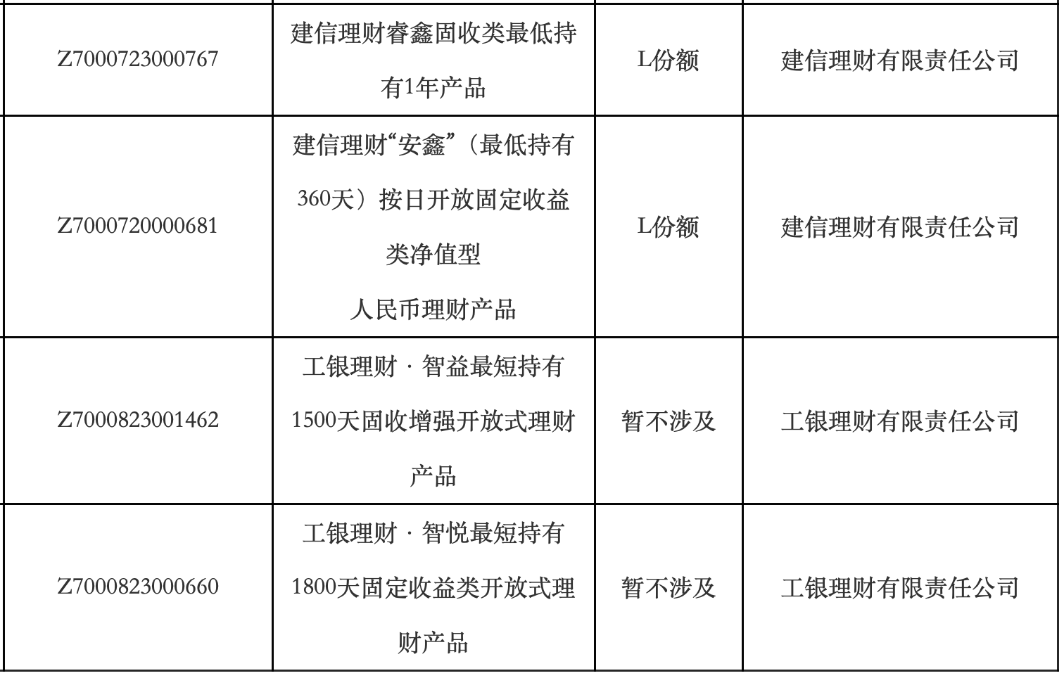 四只新增理財(cái)產(chǎn)品均為固定收益類產(chǎn)品 ,除“建信理財(cái)安鑫(最低持有360天)按日開(kāi)放固定收益類凈值型人民幣理財(cái)產(chǎn)品”風(fēng)險(xiǎn)等級(jí)為二級(jí)外,其余均為三級(jí)(中風(fēng)險(xiǎn)等級(jí)產(chǎn)品)。