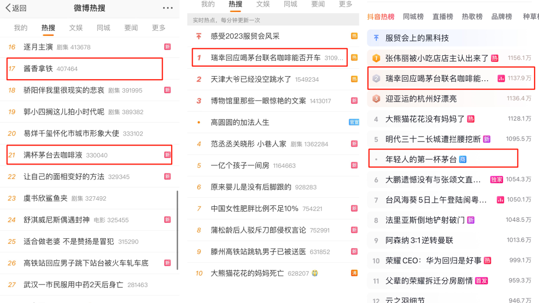 以瑞幸聯(lián)名貴州茅臺推出的“醬香拿鐵”為例。截至12月20日,含有“醬香拿鐵”的話題詞條,在微博上貢獻了24個熱搜,累計閱讀量超28億次;在抖音平臺上,累計播放量超24億次;小紅書筆記數(shù)量達10萬+篇。