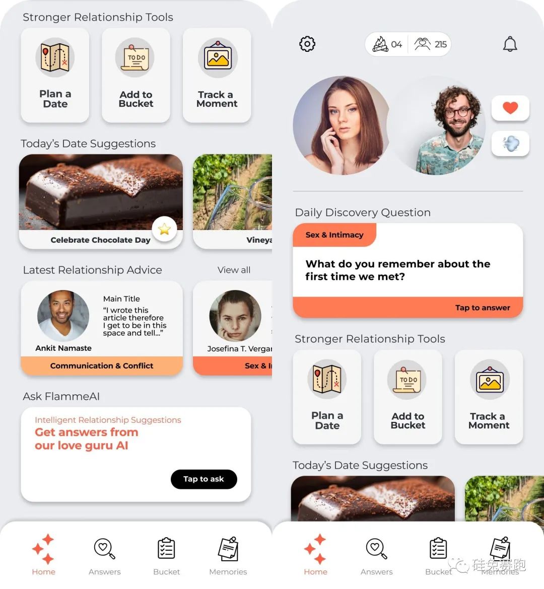 之前主打為情侶和夫妻提供約會體驗建議的Sparks也在今年改版,重新以Flamme的名字推出,并增設了基于AI的“有問必答”功能讓用戶來尋求約會和婚姻中的各種建議,它的AI可以告訴你紐約最適合約會的餐廳有什么,或者如何向你的伴侶求婚等等。與大多數(shù)約會軟件不同,F(xiàn)lamme不是為了讓用戶發(fā)現(xiàn)新對象,而是想讓情侶和夫妻在進入關系后仍保持火花,app上還有一個基于機器學習的推薦工具,會根據(jù)用戶雙方的偏好和習慣進行約會靈感推薦。
