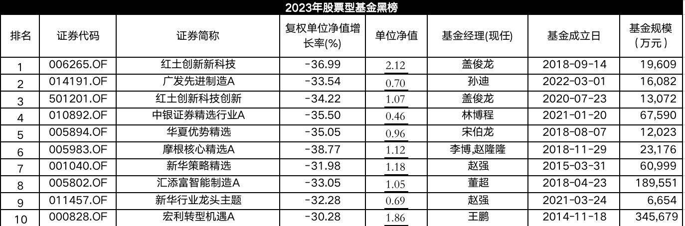 界面新聞綜合收益率、波動(dòng)率、擇時(shí)與選股等維度對(duì)普通股票型基金進(jìn)行評(píng)估,同時(shí)對(duì)上榜基金進(jìn)一步篩選,剔除資產(chǎn)規(guī)模合計(jì)低于五千萬(wàn),以及成立時(shí)間不超過(guò)1個(gè)月的基金,并排除非投資收益原因造成的凈值上漲,整理2023年度紅黑榜。