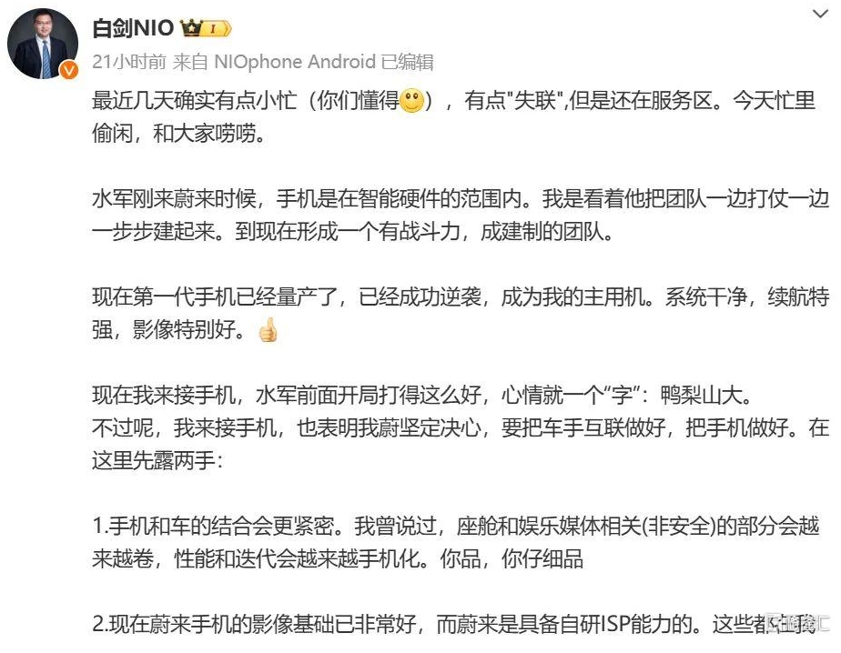 “現(xiàn)在我來(lái)接手機(jī),水軍前面開(kāi)局打得這么好,心情就一個(gè)‘字’:鴨梨山大?!?月6日下午,針對(duì)“蔚來(lái)手機(jī)負(fù)責(zé)人尹水軍將離職”的傳聞,蔚來(lái)汽車硬件副總裁白劍在社交媒體上寫道。