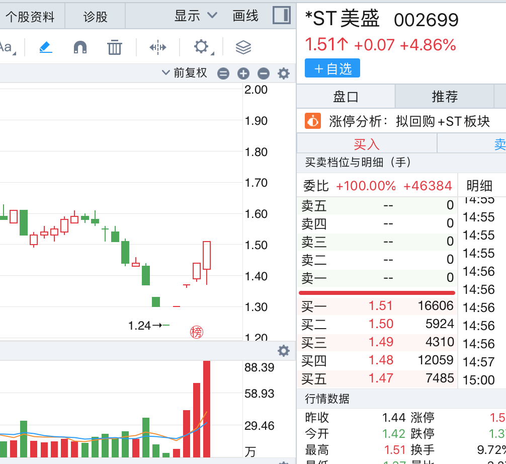 *ST美盛(002699.SZ)一份回購方案,不僅將股價(jià)從懸崖邊拉回,甚至還使其180度轉(zhuǎn)向,從不斷跌停到漲停不止,截至目前已是4個(gè)漲停。