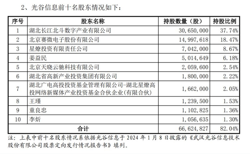 1月8日,光谷信息公告,其第一大股東、控股股東、實(shí)際控制人、一致行動(dòng)人發(fā)生變更。湖北長(zhǎng)江北斗數(shù)字產(chǎn)業(yè)有限公司(以下簡(jiǎn)稱“長(zhǎng)江北斗”)通過取得光谷信息發(fā)行的新股而成為后者的第一大股東、控股股東,新的實(shí)際控制人為湖北省人民政府國(guó)有資產(chǎn)監(jiān)督管理委員會(huì)。在此之前,光谷信息的第一大股東為賽微電子,無控股股東,實(shí)際控制人為姜益民、董朝陽(yáng)、劉坤、張凱、張文海、李炘。