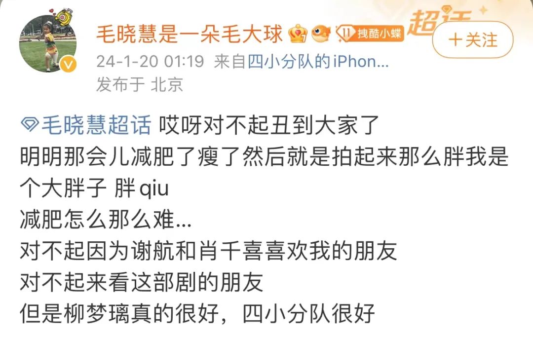 熱鬧也不止于兩位主演?!断蓜λ摹烽_(kāi)播后不久,飾演女二號(hào)“柳夢(mèng)璃”的演員毛曉慧深夜破防,連續(xù)發(fā)布好幾條微博,回應(yīng)觀(guān)眾對(duì)她長(zhǎng)相的爭(zhēng)議,表示“對(duì)不起丑到大家了”。