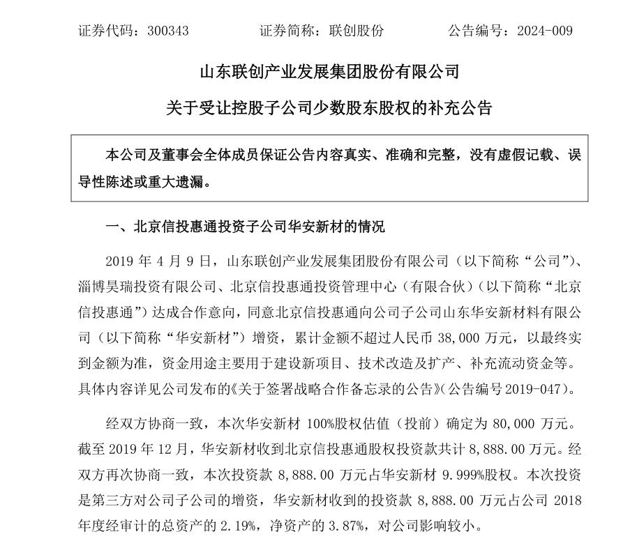 2024年1月9日,聯(lián)創(chuàng)股份發(fā)布公告稱,北京信投將其持有的華安新材9.999%股權(quán)“套現(xiàn)”,聯(lián)創(chuàng)股份作價1.43億元受讓上述股權(quán)。