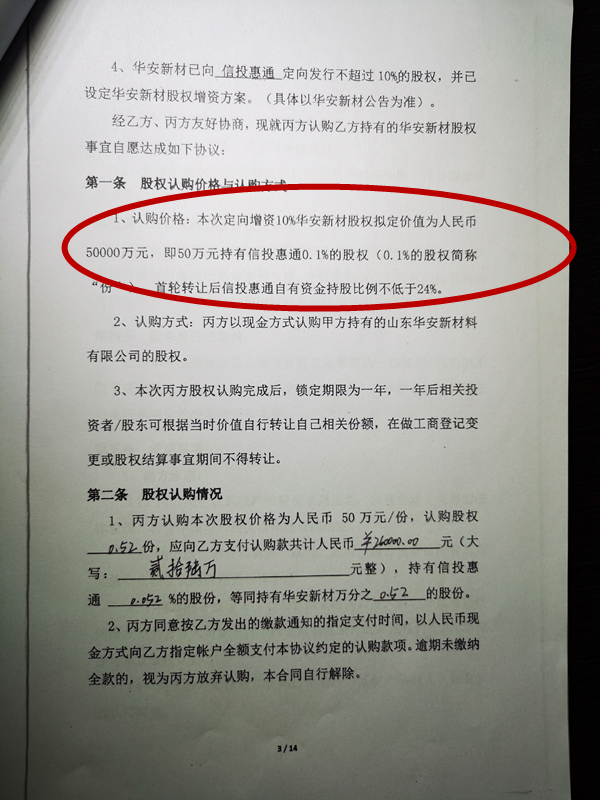 界面新聞獲取的“股份認(rèn)購協(xié)議書”和“信投惠通(華安新材)面向投資人承諾函”顯示,此次認(rèn)購方式為投資者以現(xiàn)金方式認(rèn)購北京信投持有的華安新材股權(quán),按照定向增資10%華安新材股權(quán)價值5億元計算,即人民幣50萬元/份。