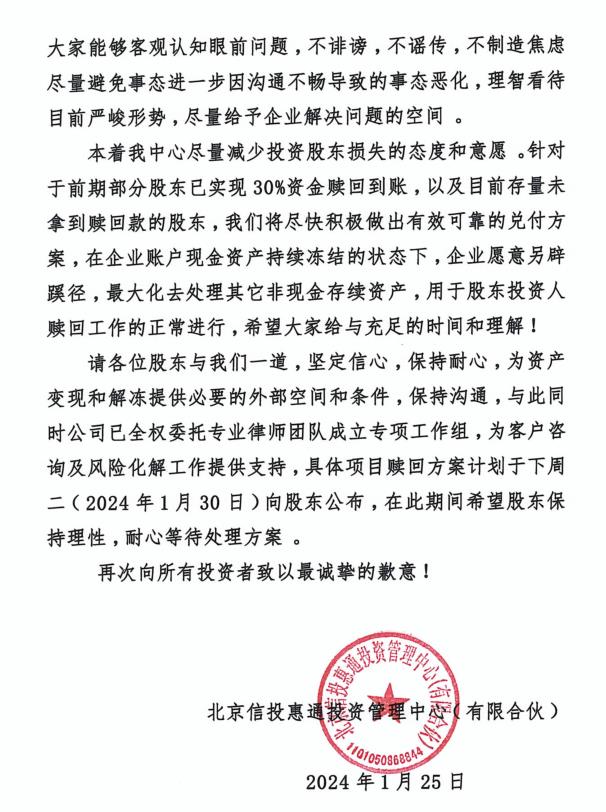 “在企業(yè)賬戶現(xiàn)金資產(chǎn)持續(xù)凍結(jié)的狀態(tài)下,企業(yè)愿意另辟蹊徑,最大化去處理其它非現(xiàn)金存續(xù)資產(chǎn)”,“具體項目贖回方案計劃于2024年1月30日公布”。