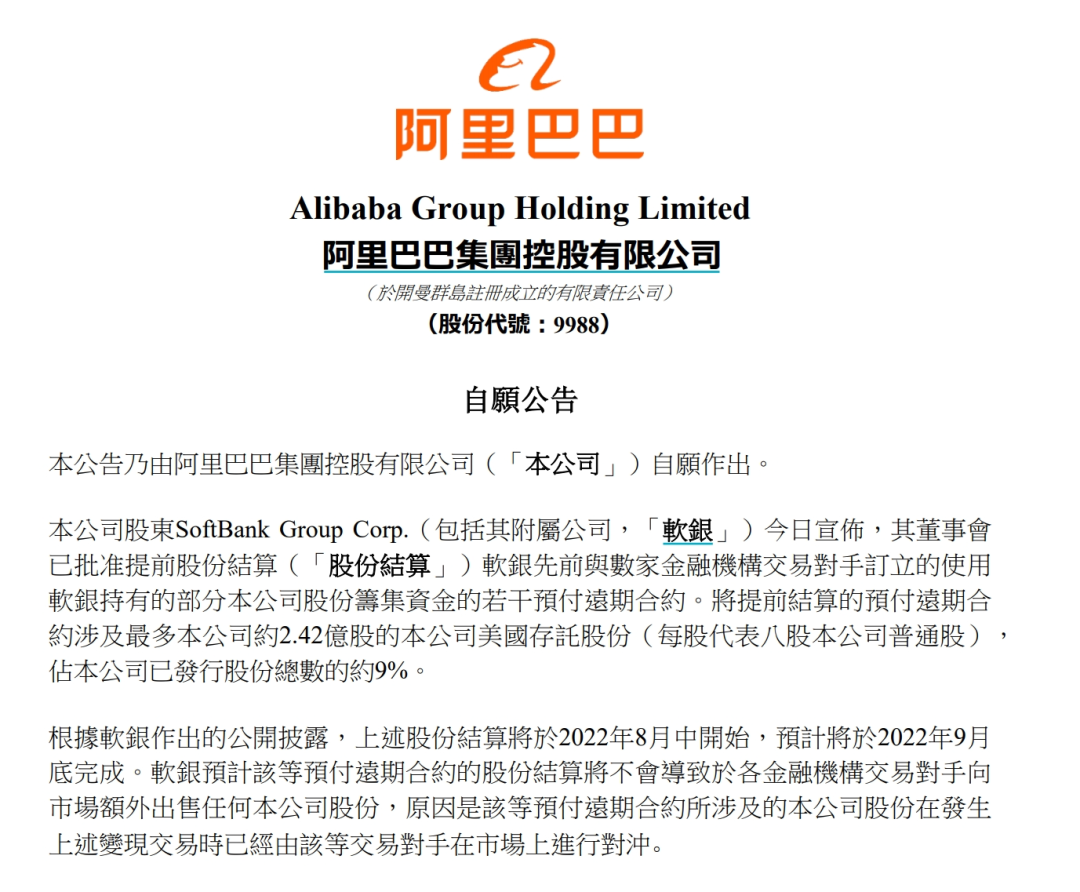 作為對(duì)比,2022年8月,阿里曾披露另一份軟銀提前結(jié)算若干預(yù)付遠(yuǎn)期合約的公告,涉及至多約2.42億股ADR,占阿里已發(fā)行總股本的9%。