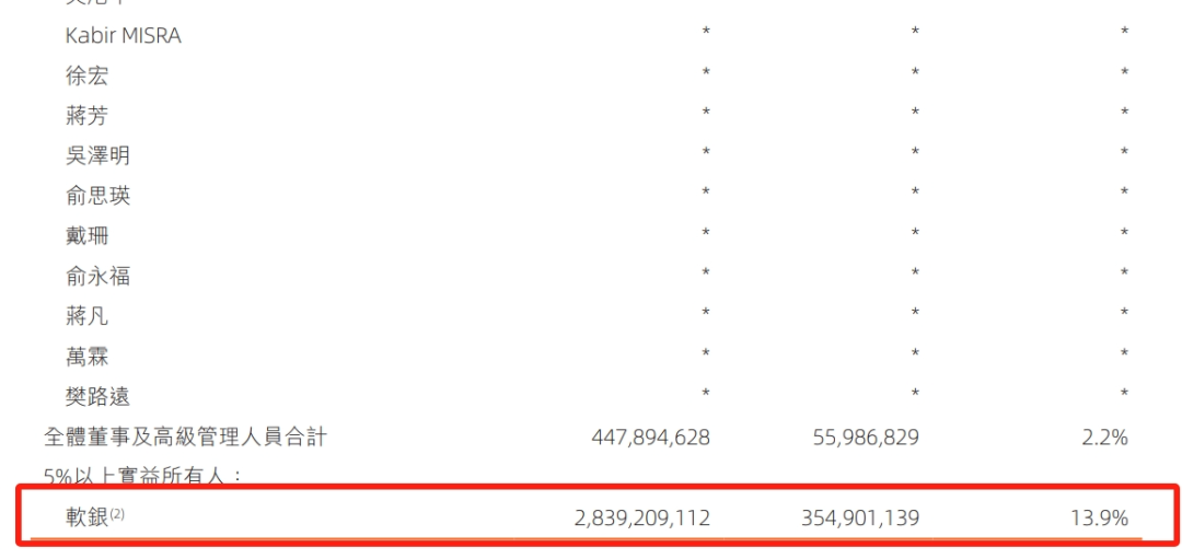 但一方面,阿里年報(bào)中標(biāo)注了馬云、蔡崇信擁有的股份是各自直接持有,可以用于單獨(dú)計(jì)算;另一方面,如果軟銀集團(tuán)的持股比例真的降至0.5%以下,那顯然無(wú)論是單算還是合算,都要少于馬云、蔡崇信任意一人。