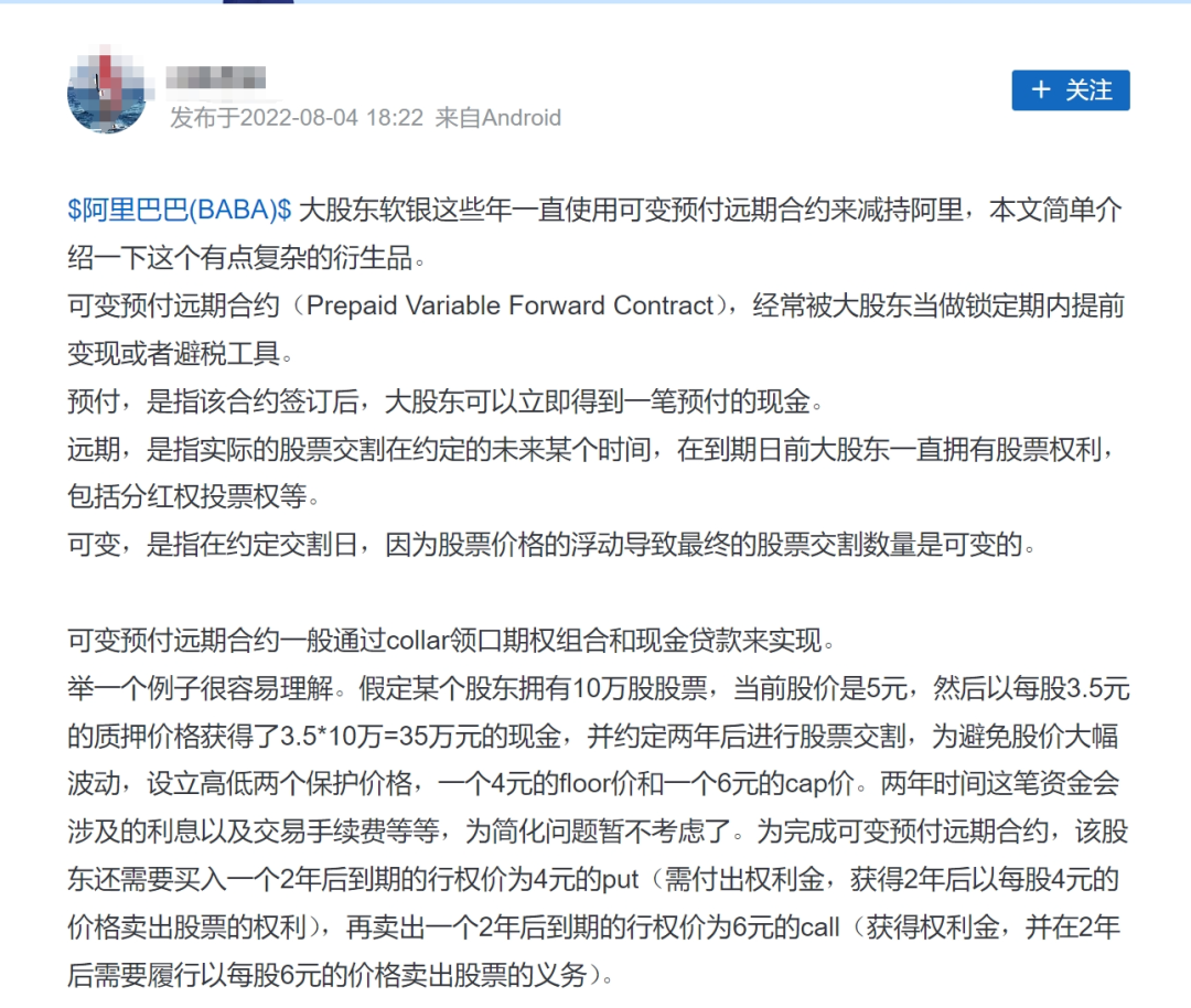 雪球上有投資者曾對(duì)“預(yù)付遠(yuǎn)期合約”進(jìn)行科普,稱(chēng)其經(jīng)常被大股東當(dāng)作鎖定期內(nèi)提前變現(xiàn)或避稅工具,用來(lái)降低股價(jià)大幅波動(dòng)給自己造成的損失。