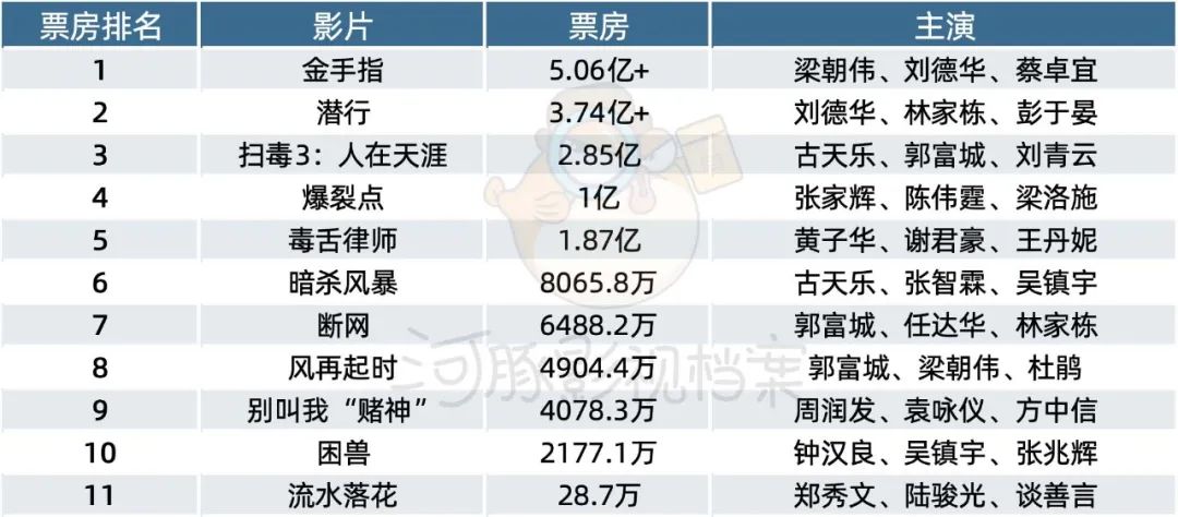 排在第31位的是去年年末上映的《金手指》,該片耗資逾3億,由莊文強自編自導(dǎo)、有梁朝偉和劉德華兩大影帝助陣,票房剛剛5億,卻已是2023年票房最高的港片。緊隨其后的是由劉德華監(jiān)制兼主演的《潛行》,該片成本2億,票房累計3.6億,遠遠沒有達到回本的成績。