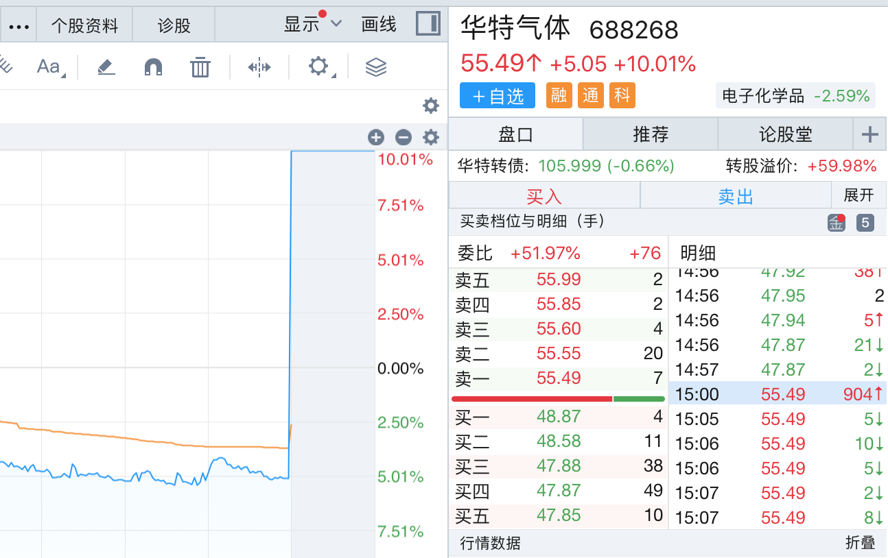 1月29日尾盤,華特氣體(688268.SH)再現(xiàn)“秒漲”。原本,該股平開低走,全天低迷,運行到下午14點57分時,跌5.1%,股價回落于47.87元。但集合競價之后,華特氣體股價跳變至55.49元,使得最終華特氣體當(dāng)天漲幅沖到了10.01%。從同花順軟件上看,55.49元的價格撮合了900來手。而在55.49元之上,還有55.55元價位、55.6元價位、55.85元價位、55.99元價位上有買單在等待。