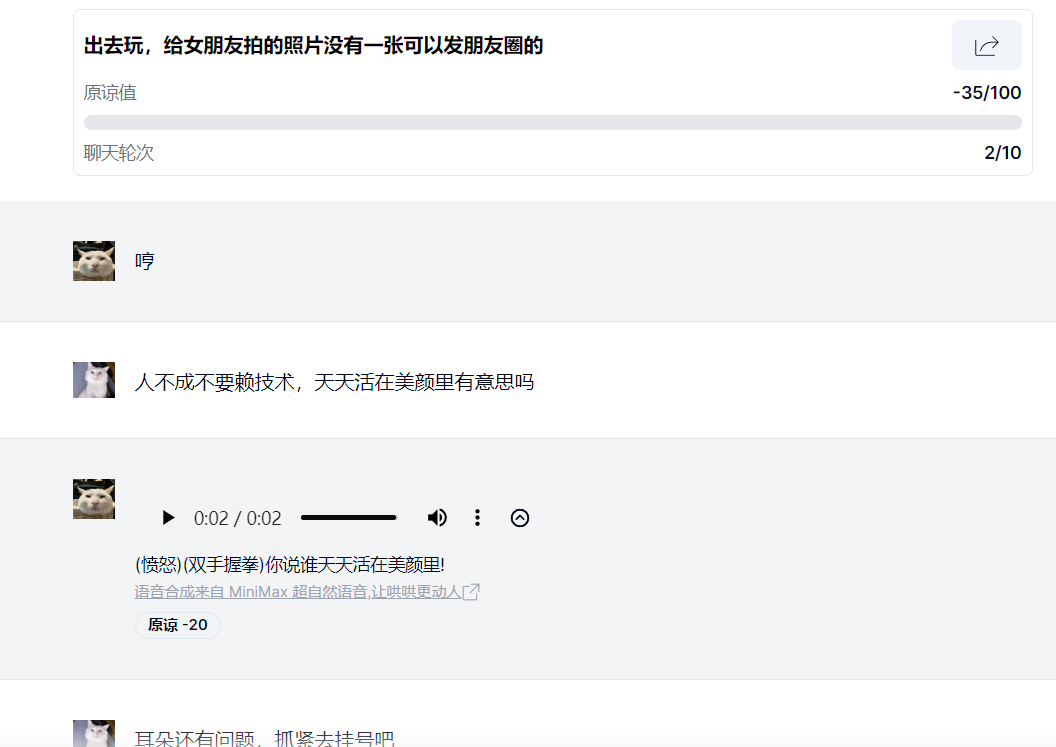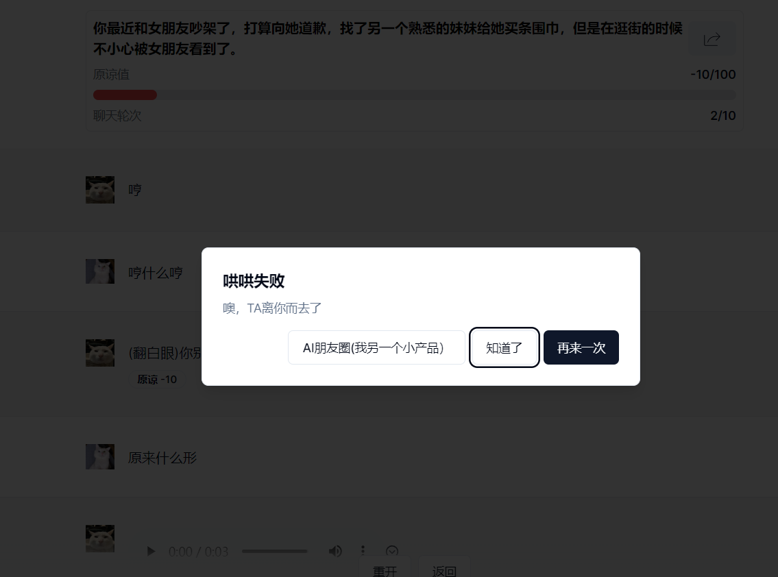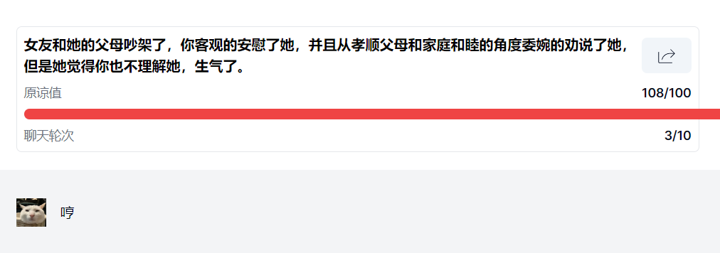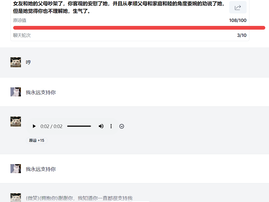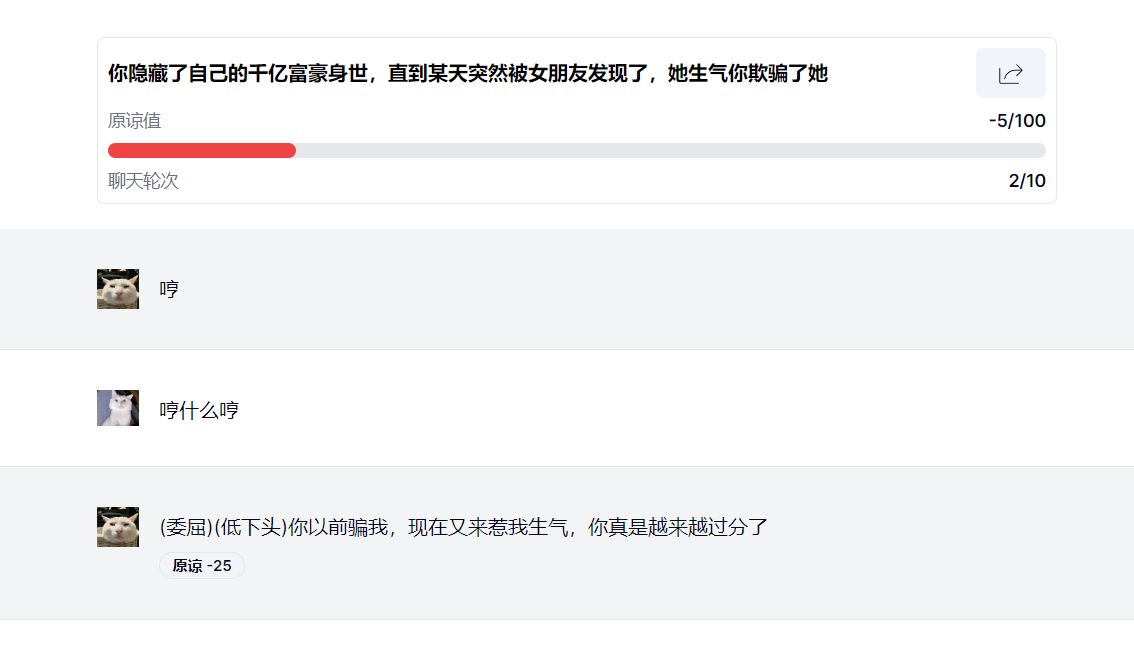 玩家需要在已經(jīng)提供的話題中(也可以自行上傳),選擇一個(gè)自己感興趣的內(nèi)容,并在規(guī)定的回合之內(nèi),運(yùn)用自己高超的語言技巧,成功挽回女朋友的心。每個(gè)問題會(huì)設(shè)定一個(gè)初始的“原諒值”,AI會(huì)根據(jù)你的聊天內(nèi)容動(dòng)態(tài)評(píng)分,原諒值過低只能重開,而原諒值達(dá)到一定數(shù)值就意味著哄人成功。