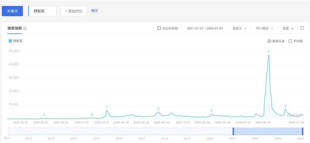 實(shí)際上,從2020年開始,預(yù)制菜在C端的關(guān)注熱度就越來越高。每到春節(jié),關(guān)于預(yù)制菜的討論不絕于耳。百度指數(shù)顯示,除了2023年9月預(yù)制菜因進(jìn)校園事件引發(fā)高關(guān)注外,其余小范圍的搜索指數(shù)高峰期都出現(xiàn)在春節(jié)期間。