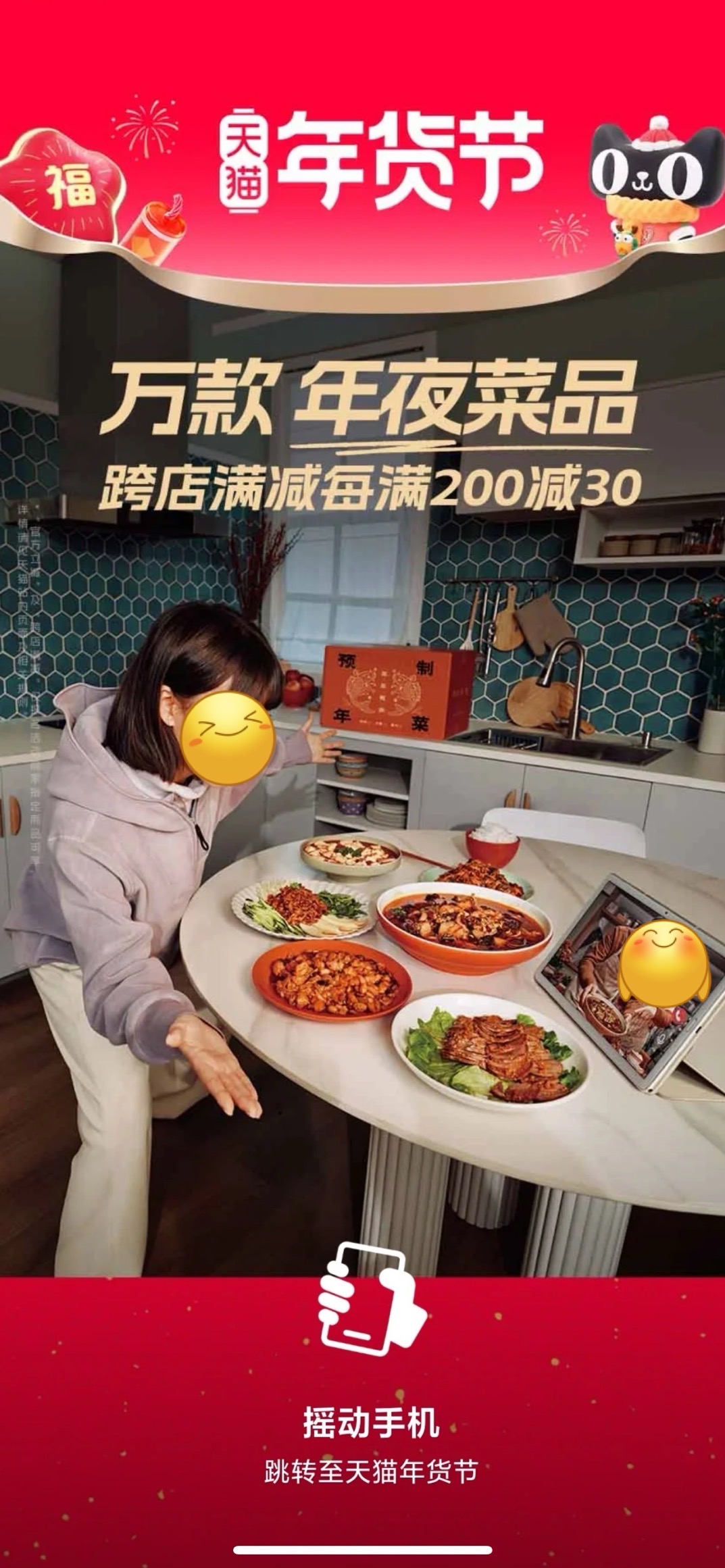 1月下旬,天貓上線了一張關(guān)于預(yù)制年菜的海報(bào)和一段視頻,“這是一份過年送自己好吃到家了的(預(yù))(制)(年)(菜)”,這張海報(bào)同時(shí)在線下廣告牌、天貓app打開界面展示。