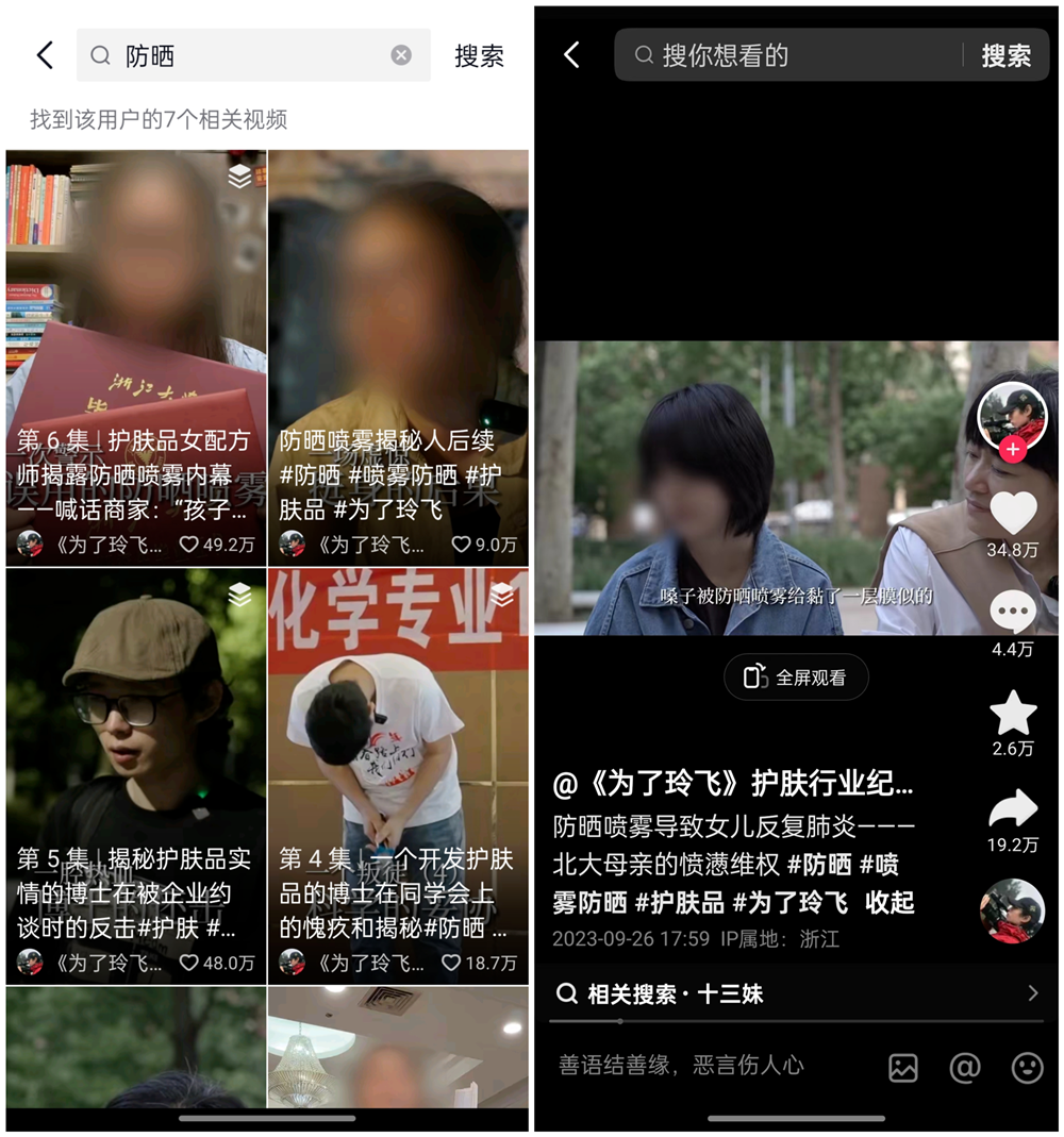 自去年爆火以來(lái),“為了玲飛”曾發(fā)布多則關(guān)于“揭秘防曬內(nèi)幕”的視頻,內(nèi)容主要涉及到防曬噴霧導(dǎo)致肺炎、防曬SPF值的市場(chǎng)謊言、防曬值虛標(biāo)等現(xiàn)象。