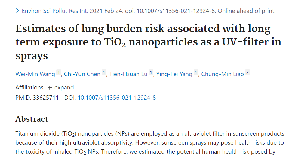 在一篇2021年發(fā)表于《Environ Sci Pollut Res Int》的文章里曾提及一二。這篇論文的研究初衷是分析常用防曬劑:二氧化鈦納米顆粒吸入后的影響。結(jié)果顯示,在長(zhǎng)期使用的場(chǎng)景下,每天噴66次,用量40克以上才會(huì)有影響。最終作者評(píng)估,使用防曬噴霧不構(gòu)成威脅。