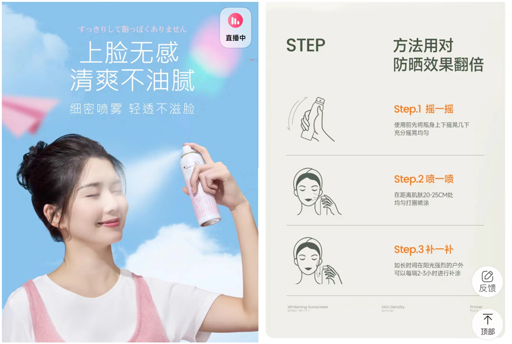 雖然目前市面上有多款防曬噴霧都會(huì)在標(biāo)簽或商品詳情頁(yè)注明“請(qǐng)勿在密閉空間內(nèi)使用”“請(qǐng)勿對(duì)準(zhǔn)口鼻眼使用”“距離皮膚20-25cm處使用”等使用安全用語(yǔ)提醒。但在電商平臺(tái)上,仍然有部分商家存在不當(dāng)?shù)男Q(chēng)和暗示用語(yǔ),引導(dǎo)防曬噴霧可直接對(duì)臉使用。