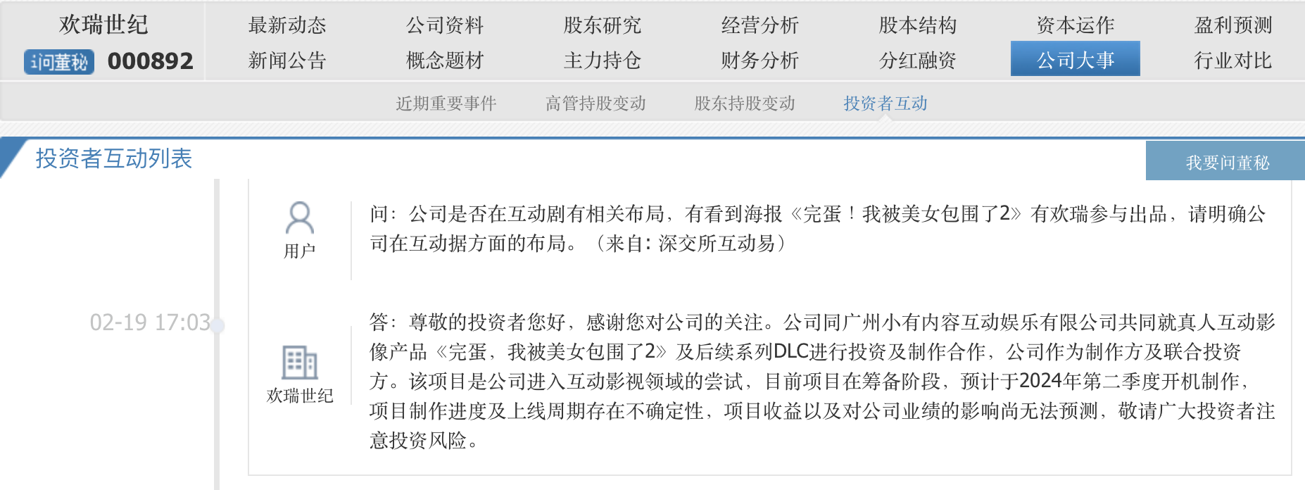 據(jù)歡瑞世紀(jì)(000892.SZ)在互動(dòng)平臺(tái)上的描述,公司同廣州小有內(nèi)容互動(dòng)娛樂(lè)有限公司共同就真人互動(dòng)影像產(chǎn)品《完蛋,我被美女包圍了2》及后續(xù)系列DLC進(jìn)行投資及制作合作,公司作為制作方及聯(lián)合投資方。該項(xiàng)目是公司進(jìn)入互動(dòng)影視領(lǐng)域的嘗試,目前項(xiàng)目在籌備階段,預(yù)計(jì)于2024年第二季度開(kāi)機(jī)制作。當(dāng)然歡瑞世紀(jì)也表示,項(xiàng)目制作進(jìn)度及上線周期存在不確定性,項(xiàng)目收益以及對(duì)公司業(yè)績(jī)的影響尚無(wú)法預(yù)測(cè),敬請(qǐng)廣大投資者注意投資風(fēng)險(xiǎn)。