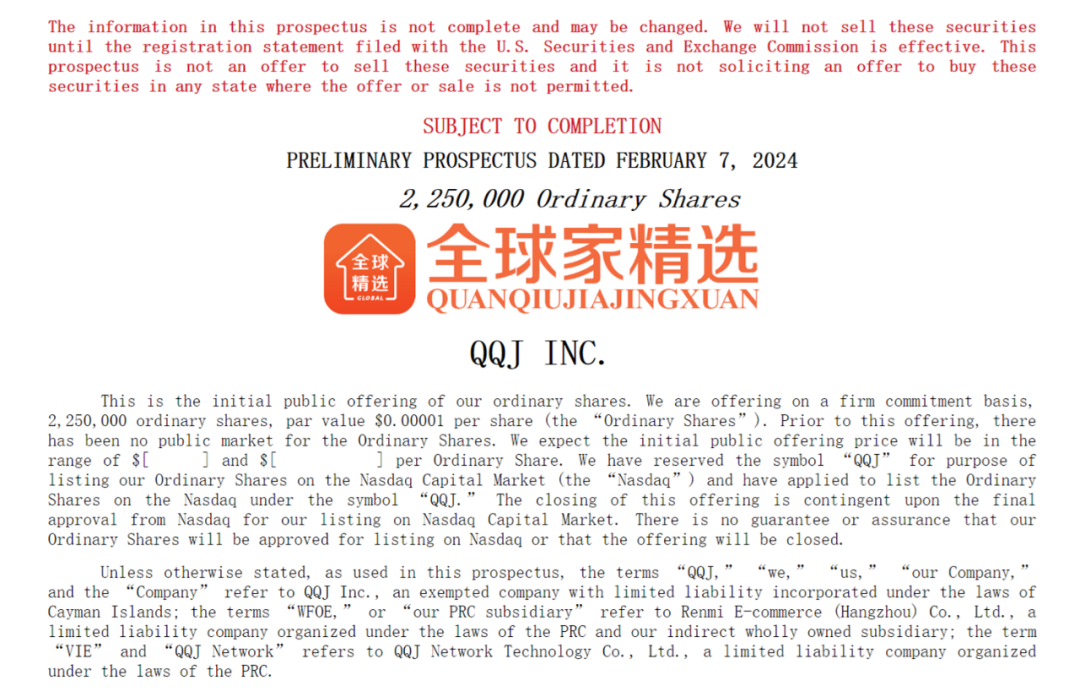 近日,仁彌(杭州)網絡科技有限公司(以下簡稱“仁彌科技”)的開曼控股公司QQJ Inc.向SEC(美國證券交易委員會)遞交了招股書,擬在納斯達克IPO上市,股票代碼“QQJ”。