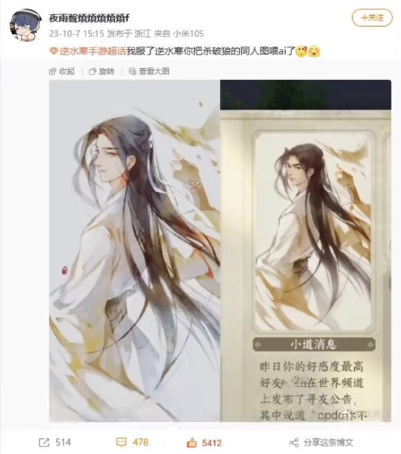但10月份有玩家爆料,《大宋頭條》相關(guān)內(nèi)容的生成,疑似用了玩家創(chuàng)作的同人圖投喂,使得報(bào)刊中繪圖與同人圖呈現(xiàn)驚人相似。