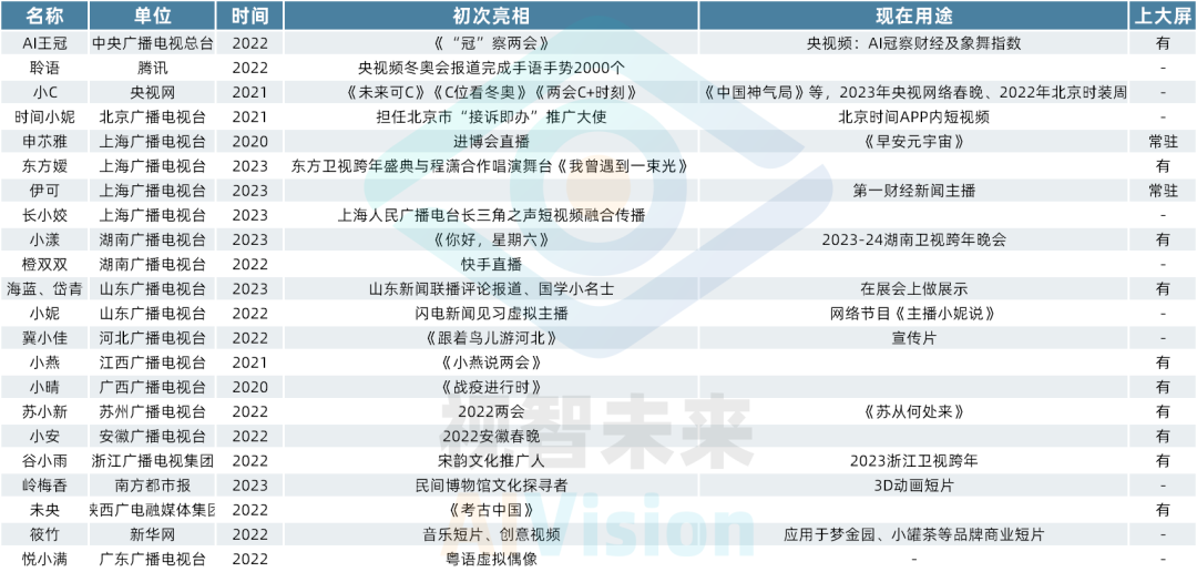 視智未來(lái)結(jié)合公開(kāi)資料,整理了一份截至2023年底,國(guó)內(nèi)廣電傳媒機(jī)構(gòu)近年來(lái)開(kāi)發(fā)和應(yīng)用的AI數(shù)字人不完全統(tǒng)計(jì)。