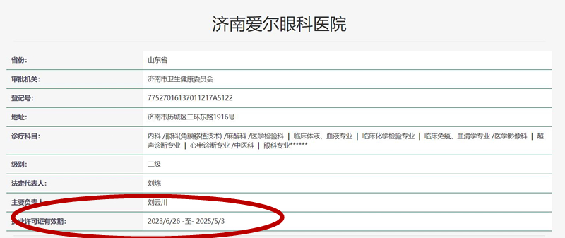 界面新聞通過查閱國家衛(wèi)健委醫(yī)院執(zhí)業(yè)登記信息,顯示濟(jì)南愛爾眼科醫(yī)院的執(zhí)業(yè)許可證有效期為2023年6月26日至2025年5月3日。