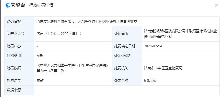 天眼查一則經(jīng)營風(fēng)險(xiǎn)信息顯示,濟(jì)南愛爾眼科醫(yī)院有限公司因未取得醫(yī)療機(jī)構(gòu)執(zhí)業(yè)許可證擅自執(zhí)業(yè),違反了《基本醫(yī)療衛(wèi)生與健康促進(jìn)法》第九十九條第一款規(guī)定。對(duì)此,濟(jì)南市市中區(qū)衛(wèi)生健康局罰款5萬元,處罰決定日期為2024年1月19日。
