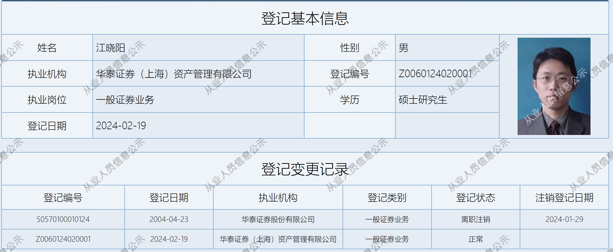 2024年1月29日,江曉陽(yáng)在華泰證券登記注銷,隨后于2月19日登記入職華泰資管。