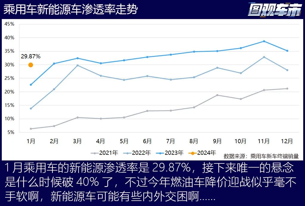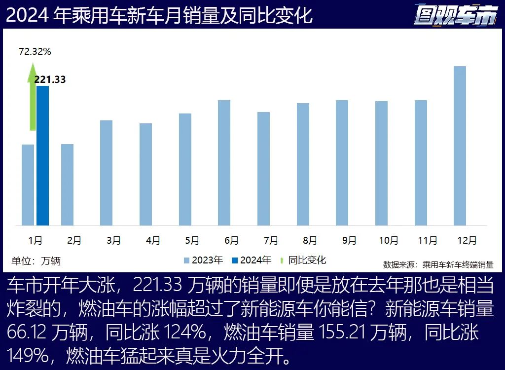 2024車市開(kāi)年大漲,1月乘用車新車終端銷量223.21萬(wàn)輛,同比大漲72.32%。這個(gè)超高漲幅雖與去年1月適逢春節(jié)的低銷量基礎(chǔ)有關(guān),但這個(gè)銷量也是扎扎實(shí)實(shí)的高,去年只在12月看到了超200萬(wàn)輛的成績(jī)。