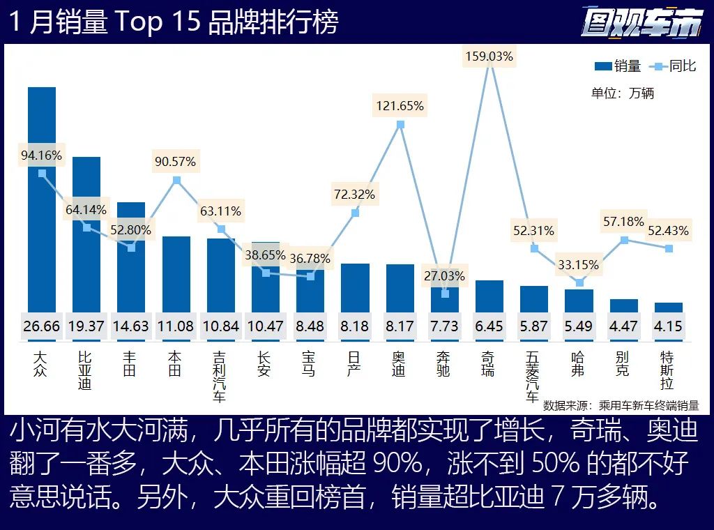 1月大眾以26.66萬(wàn)輛的成績(jī)重回榜首,比去年12月還增長(zhǎng)了4.58%,比亞迪銷量不到20萬(wàn)輛屈居第二,比去年12月減少了24.57%。各個(gè)品牌1月同比增長(zhǎng)不稀奇,比去年12月還高的就厲害了,除了大眾,環(huán)比增長(zhǎng)的還有吉利、長(zhǎng)安、寶馬、奧迪、奔馳、奇瑞這幾家,其中奇瑞同比大漲159%。