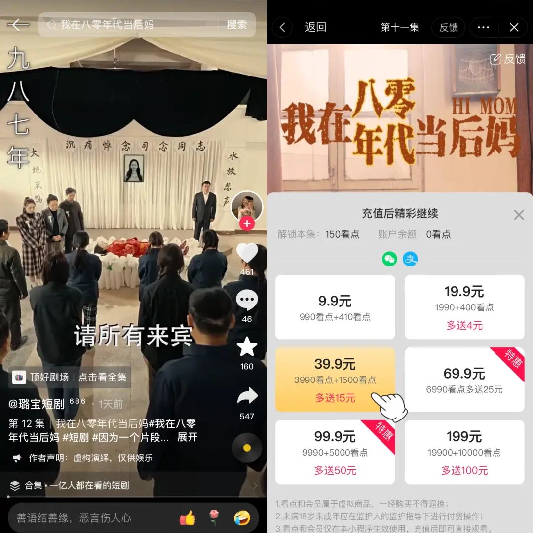 為了吸引用戶(hù),平臺(tái)通常會(huì)設(shè)置10集免費(fèi)觀看。在前面集數(shù)的吸引下,對(duì)劇情感興趣的用戶(hù)就會(huì)忍不住下單購(gòu)買(mǎi)。以“網(wǎng)劇吧”為例《我在八零后當(dāng)后媽》,一集劇情需要150看點(diǎn),最低充值9.9元,獲得1400看點(diǎn),大約可以看十集,充值越多,送的看點(diǎn)數(shù)越多。不同平臺(tái)的價(jià)格各不相同,看完這部劇,花費(fèi)的價(jià)格在9.9元-99元不等。