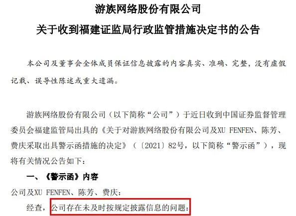 其中,2021年12月23日,游族網(wǎng)絡(luò)因存在未及時(shí)按規(guī)定披露信息的問(wèn)題,被福建證監(jiān)局給予警示,并記入證券期貨市場(chǎng)誠(chéng)信檔案。
