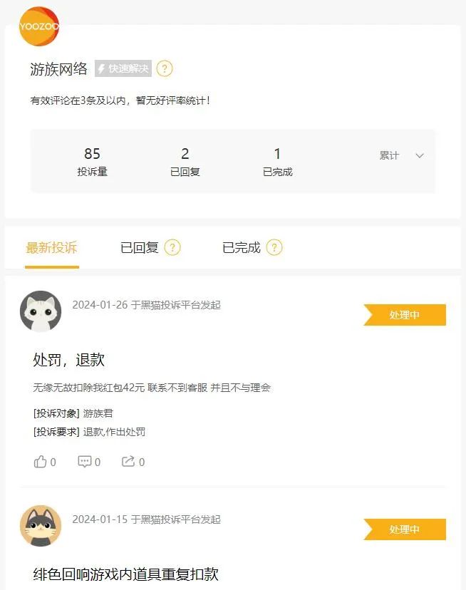 在黑貓投訴網(wǎng)站,對(duì)于游族網(wǎng)絡(luò)的投訴則主要集中在扣款、退款等問(wèn)題上。