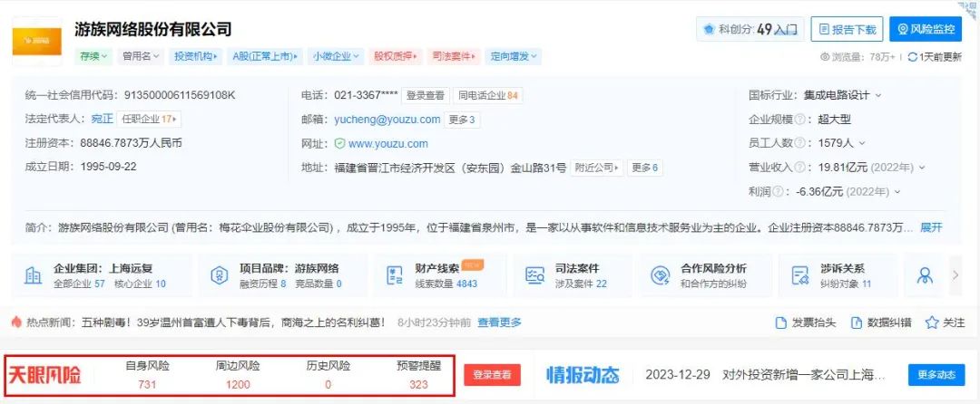 此外,游族網(wǎng)絡(luò)在天眼查的相關(guān)風(fēng)險(xiǎn)警示也不在少數(shù),其自身風(fēng)險(xiǎn)達(dá)到了731條,周邊風(fēng)險(xiǎn)更高達(dá)1200條,在上市公司中都屬于比較高的。