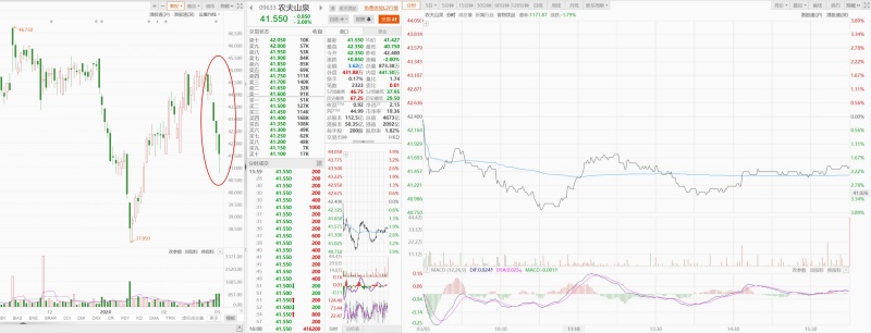 截至3月5日收盤(pán),農(nóng)夫山泉股價(jià)連續(xù)三天錄得下跌。3月5日開(kāi)盤(pán)后,農(nóng)夫山泉股價(jià)迅速下挫,并在11:00后觸及當(dāng)天股價(jià)低點(diǎn),隨后在中午出現(xiàn)一輪反彈;最終,農(nóng)夫山泉每股收盤(pán)價(jià)為41.55港元,跌2.00%。