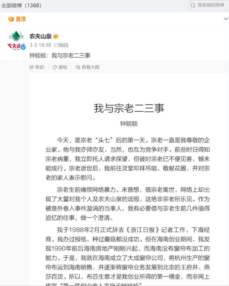 備受關(guān)注的是,此前,3月3日農(nóng)夫山泉官方微博發(fā)布了題目為《鐘睒睒:我與宗老二三事》的文章。農(nóng)夫山泉?jiǎng)?chuàng)始人、董事長(zhǎng)、總經(jīng)理鐘睒睒?lè)Q,網(wǎng)絡(luò)上出現(xiàn)了大量對(duì)其個(gè)人及農(nóng)夫山泉的詆毀;作為被意外卷入事件漩渦的當(dāng)事人,他有必要借與宗老生前幾件值得追憶的往事,做一個(gè)澄清。