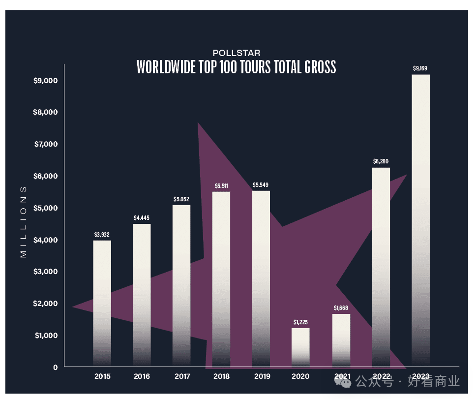 據(jù)全球演出市場票房數(shù)據(jù)服務(wù)及媒體公司Pollstar統(tǒng)計,2023年,全球TOP100巡演的總票房從2022年的62.8億美元大增46%,達(dá)到91.7億美元。單場平均票房從154萬美元飆升到237萬美元,漲幅53.2%。