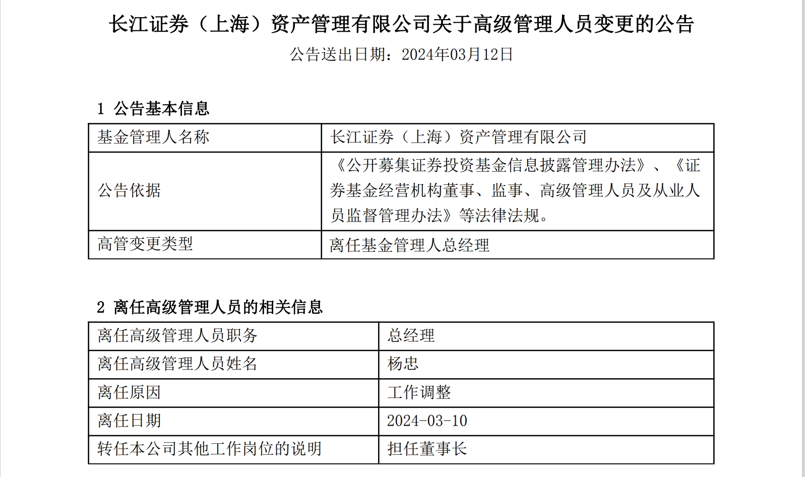 高占軍因工作調(diào)整離任董事長職務(wù),經(jīng)長江資管第三屆董事會(huì)第二十六次會(huì)議審議通過,總經(jīng)理?xiàng)钪耀@選任董事長,并代為履行總經(jīng)理工作。二者職務(wù)變動(dòng)時(shí)間均為2024年3月10日。