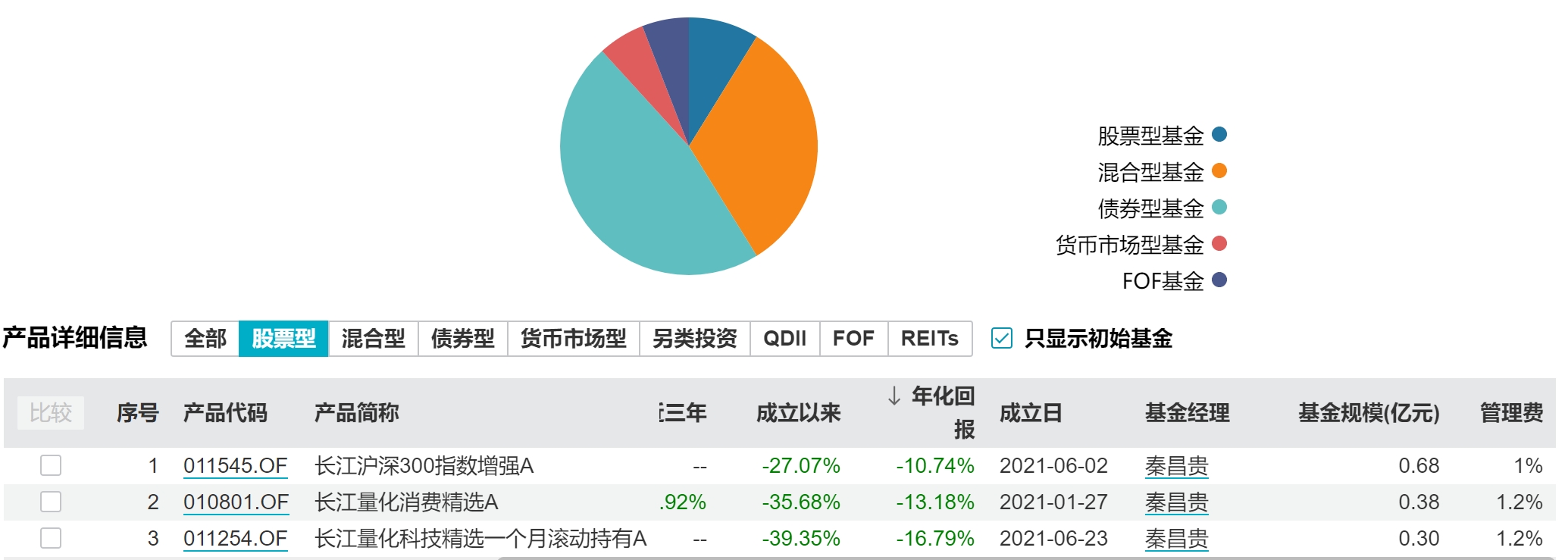 三只股票型基金(基金份額合并計(jì)算,下同)合計(jì)規(guī)模僅1.71億元。其中,長江量化消費(fèi)精選A(010801.OF)和長江量化科技精選一個(gè)月滾動(dòng)持有A(011254.OF)基金資產(chǎn)凈值均不足4000萬元。