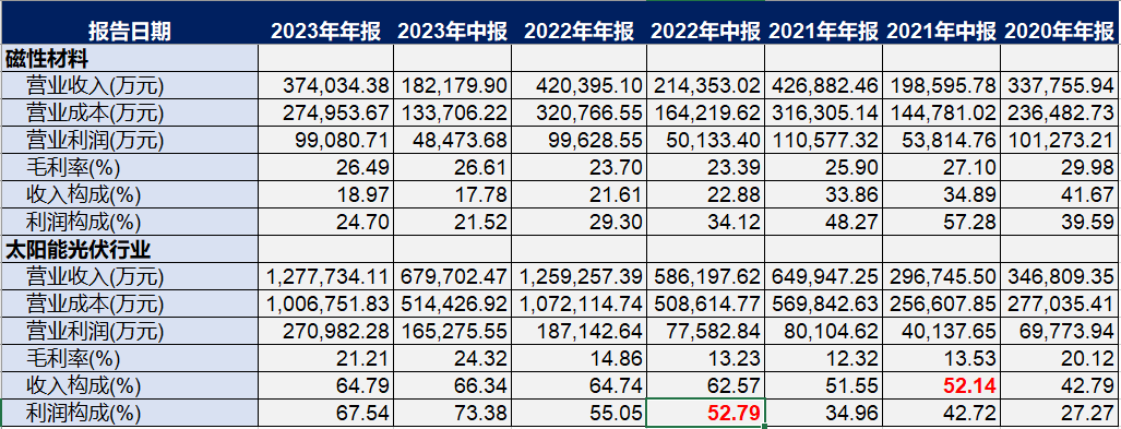 2020年時,公司來自光伏的營收首度超過起家產(chǎn)業(yè)磁性材料,2021年中報時,光伏營收占比過半,2022年中報時,來自光伏的利潤貢獻占比過半。2023年,來自光伏的營收和利潤都超過六成,成為公司絕對的第一主業(yè)。