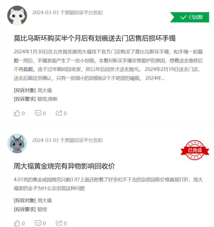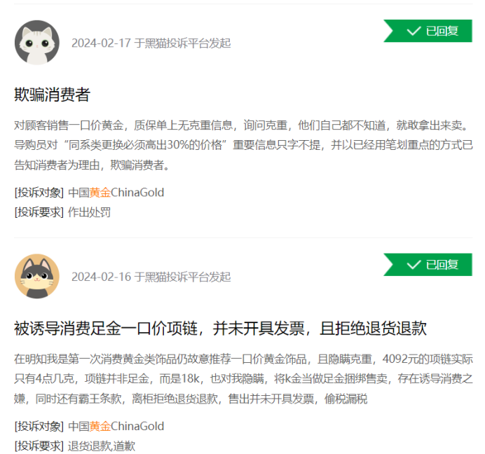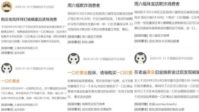 同時(shí),在黑貓投訴平臺(tái),截至3月15日,涉及“黃金”的投訴有33126條,投訴熱點(diǎn)集中在黃金掉色、誘導(dǎo)消費(fèi)者、拒絕稱重等問(wèn)題。而周六福、中國(guó)黃金(600916.SH)、周生生(0116.HK)、周大福(1929.HK)、老鳳祥(600612.SH)、潮宏基(002345.SZ)等國(guó)內(nèi)頭部黃金品牌均有涉及。