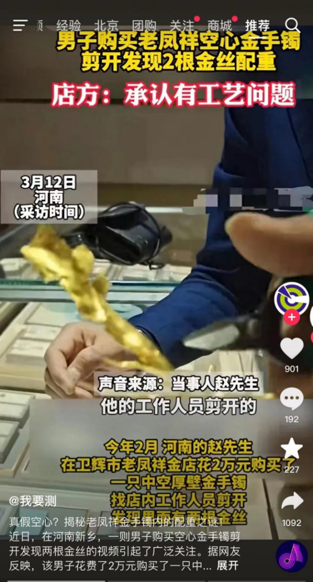 3月12日,“2萬(wàn)買(mǎi)金手鐲有聲響,剪出2根金絲”的話題登上微博熱搜,讓老字號(hào)金店老鳳祥(600612.SH)陷入輿論漩渦。